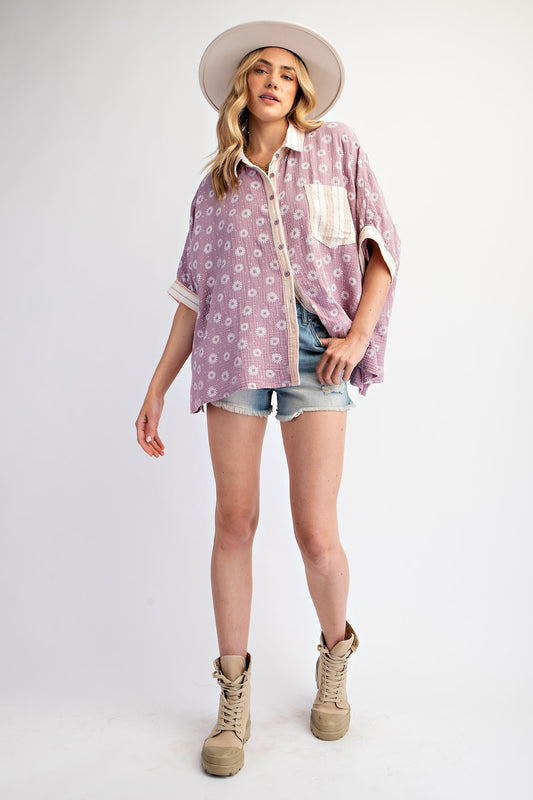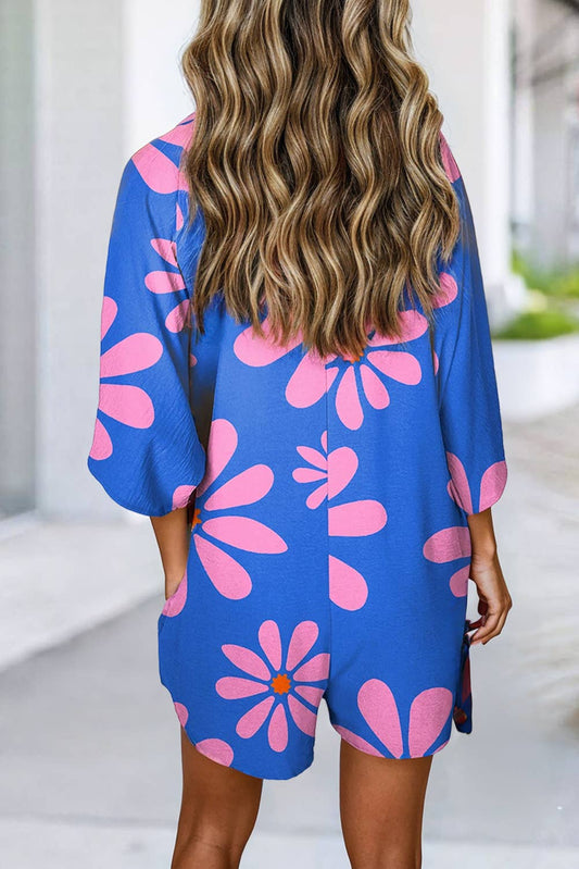 Floral Boxy Fit Ruffled Short Sleeve V Neck Blouse