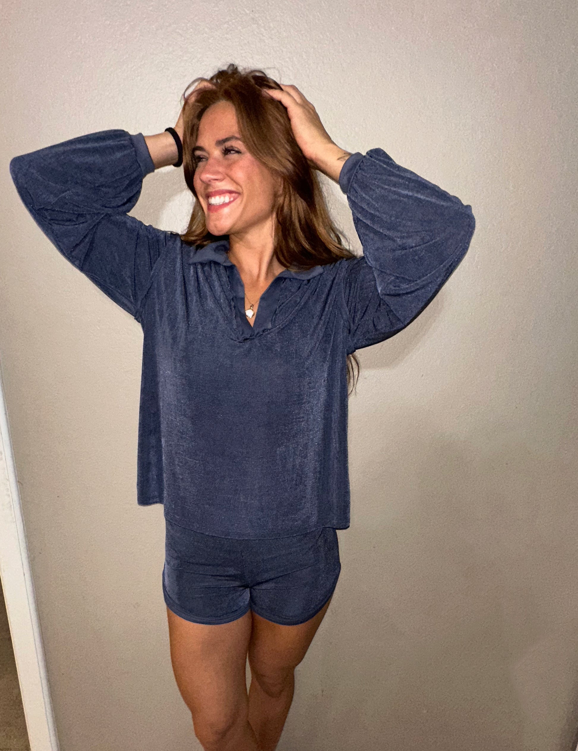 Slip into something more comfortable! This adorable midnight blue set is like a big hug from a silky smooth blanket. The top is slightly oversized and the bottoms have a fit like biker shorts. Runs small. Model is size 00 and wearing the small. If in between-size up. For a more oversized fit, size up for sure! The perfect set for binge watching Love Island 💙