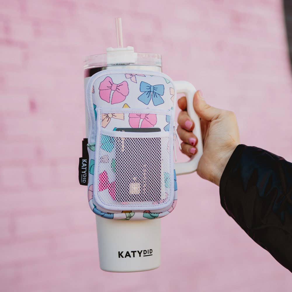 “Your tumbler’s new favorite belt bag!” 7” x 4.75” neoprene material large zipper pocket 2 exterior pockets (one netted) for cards or phone adjustable velcro strap to go around tumbler or bottle!